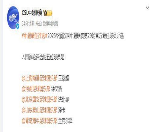 11月4日,中超官方公布第29轮最佳球员候选名单,王燊超、钟义浩、法比奥、泽卡、兰克尔·泽在列。 王燊超(上海海港)2射1正1进球 钟义浩(河南队)1射1正1进球 法比奥(北京国安)6射4正2进球 泽卡(山东泰山)4射2正1进球 兰克尔泽(青岛海牛)2射1正1进球