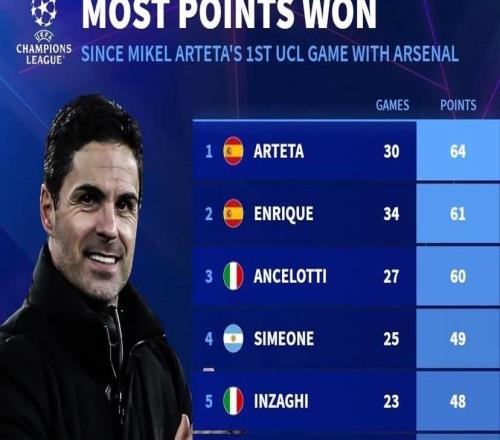 自执教阿森纳欧冠首秀以来,阿尔特塔欧冠拿分所有主帅第一